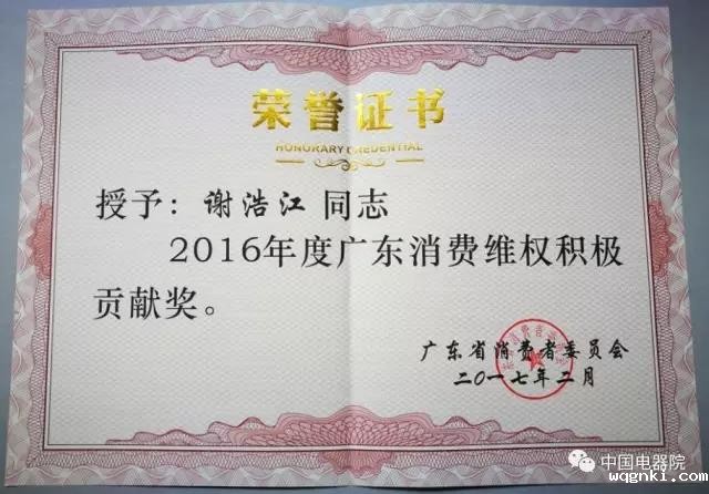 2月24日,由广东省消费者委员会主办的第二届“广东消费维权积极贡献奖”表彰大会暨省消委会消费维权志愿者队伍成立仪式在广州隆重举行,正式拉开2017年广东“3.15”宣传纪念系列活动序幕。来自司法部门、行业协会、专业机构,以及法律界、新闻界的15名消费维权公益人士出席活动并接受表彰,中国电器院旗下威凯检测技术有限公司(简称”CVC威凯“)总经理谢浩江热心消费维权公益工作,对广东消费维权作出重要贡献,被广东省消委会授予“广东消费维权积极贡献奖”。