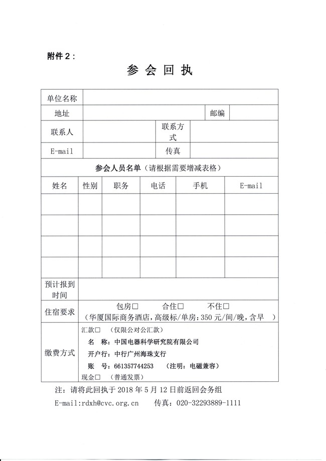 为做好本次会议的会务及资料准备工作,请各参会代表填写《参会回执》(附件2),于5月12日前发回会务组。