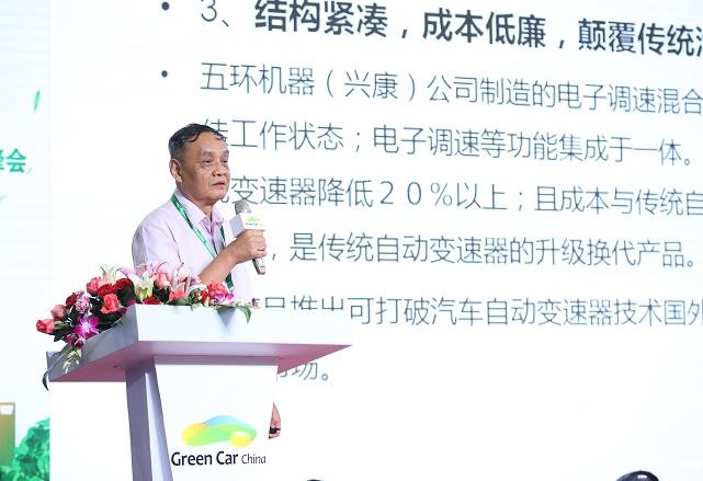 五环机器公司董事长冯幸平在演讲中介绍了该公司最新研发的成果——电子调速混合动力变速器。冯幸平介绍,经过近十年的研究,绕过丰田PS的专利地位,实现了与丰田技术路线完全相当的一个PS技术,而且结构比丰田还简单。目前有多项国家发明专利,具有与世界混合动力先进水平同步的技术。该技术可替代传统燃油动力系统,不仅能通过电子调速,而且能回收能量,实现动力总成的节油节能,实现混合动力系统的升级换代。其次,该技术的成本除了电池以外已经可以做到15000元以下,不仅能够替代现有的混合动力系统,而且能够替代现有传统的自动变速器。因为大家知道,传统的自动变速器,不管任何一个变速器,它都是基于机械变速的概念,而这个系统是完全抛弃了机械变速,实现电子调速,用电子技术来调速。电子技术调速在很多领域已经应用得非常广了,但是汽车还没有,所以这个不仅仅是可以替代传统的燃油混合动力,而且可以替代传统的自动变速器。而且这个产品体积、重量跟现在的传统的自动变速器差不多。