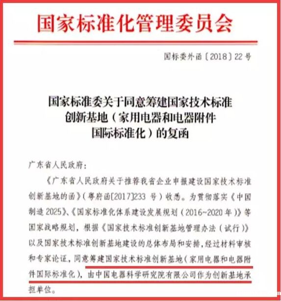 以先进标准引领消费品质量升级是实施“中国制造2025”重要的抓手。中国电器院获国家标准委员委正式批复,同意建设“国家技术标准创新基地(家用电器和电器附件国际标准化)”。