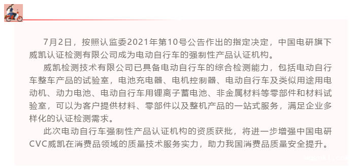 CVC威凯成为认监委指定的电动自行车强制性产品认证实施机构