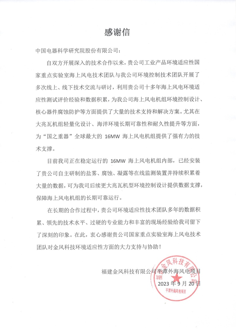 在该项目中,国重室在海上风电机组环境控制设计、核心器件腐蚀防护、大兆瓦机组轻量化设计、海洋环境长期可靠性和耐久性提升等方面,为风电机组成功运行提供了强有力的技术支持。这也是国重室参与开发的大兆瓦风机一体化环控技术的最新成功应用案例。近日,金风科技福建平潭外海16MW海上风电项目部给taptap下载安装在哪工业产品环境适应性全国重点实验室(以下简称“国重室”)特地发来感谢信。